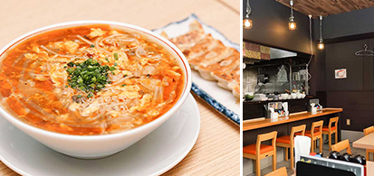 ・ 「博多呉服」から徒歩7分(約500m)香ばしい香りに誘われる、人気の「麺酒場 朱拉(しゅら)」。