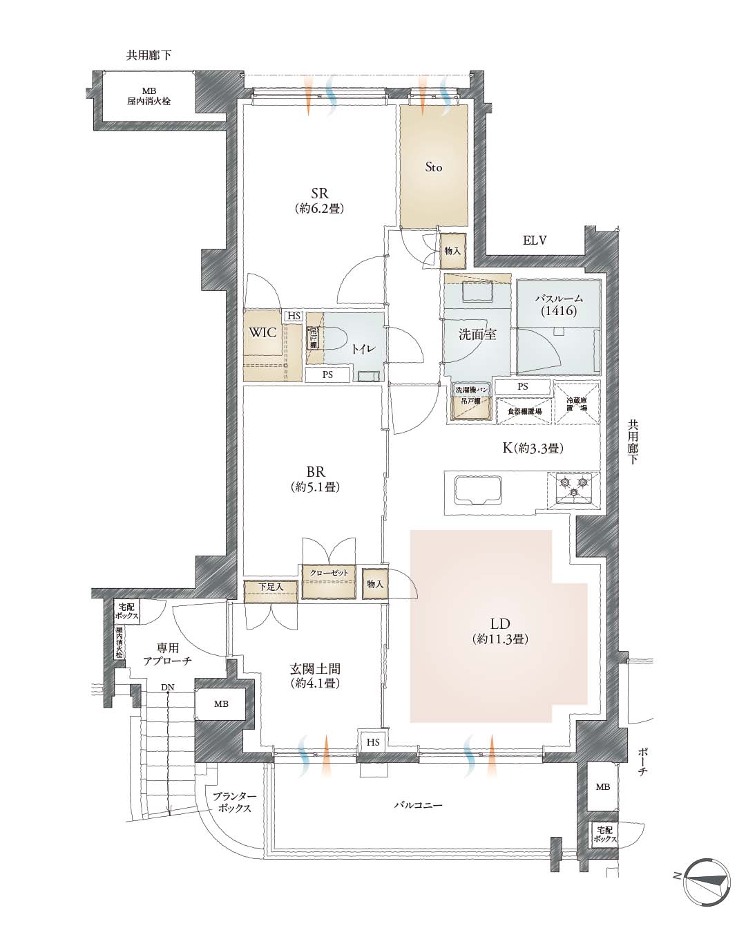 :採光LD:リビング・ダイニング K:キッチン BR:ベッドルーム SR:サービスルーム(納戸) WIC:ウォークインクローゼット Sto:ストレージ PS:パイプスペース HS:住戸内パイプスペース(畳数に含まれる配管スペース) MB:メーターボックス ELV:エレベーター