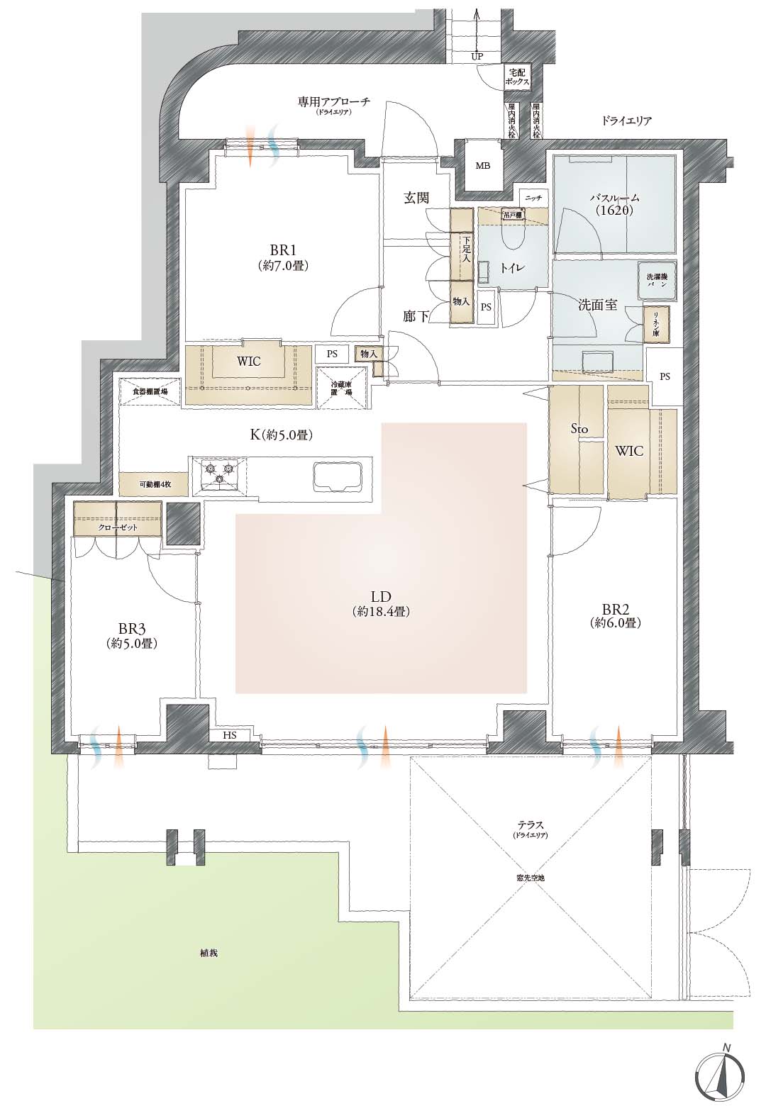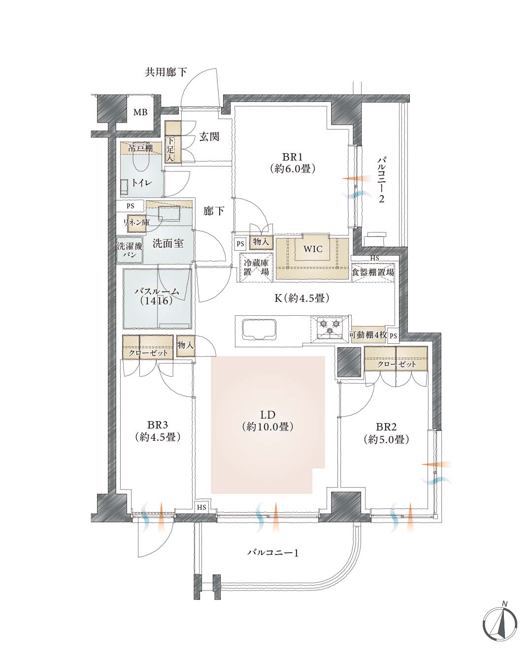 :採光LD:リビング・ダイニング K:キッチン BR:ベッドルーム WIC:ウォークインクローゼット PS:パイプスペース HS:住戸内パイプスペース(畳数に含まれる配管スペース) MB:メーターボックス