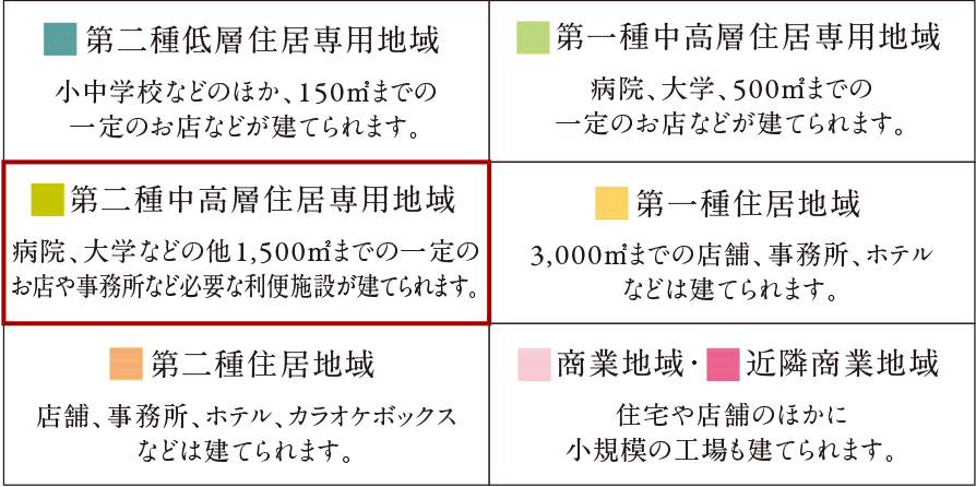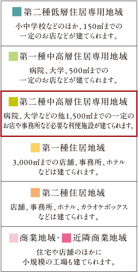 周辺は住宅専用の用途に供することを目的として区分された第二種中高層住居専用地域に指定されており、穏やかな環境が形成されています。また、東京都文教地区建築条例における第一種文教地区にも指定されており、建築物の種類・用途についても細かな制限が設けられています。