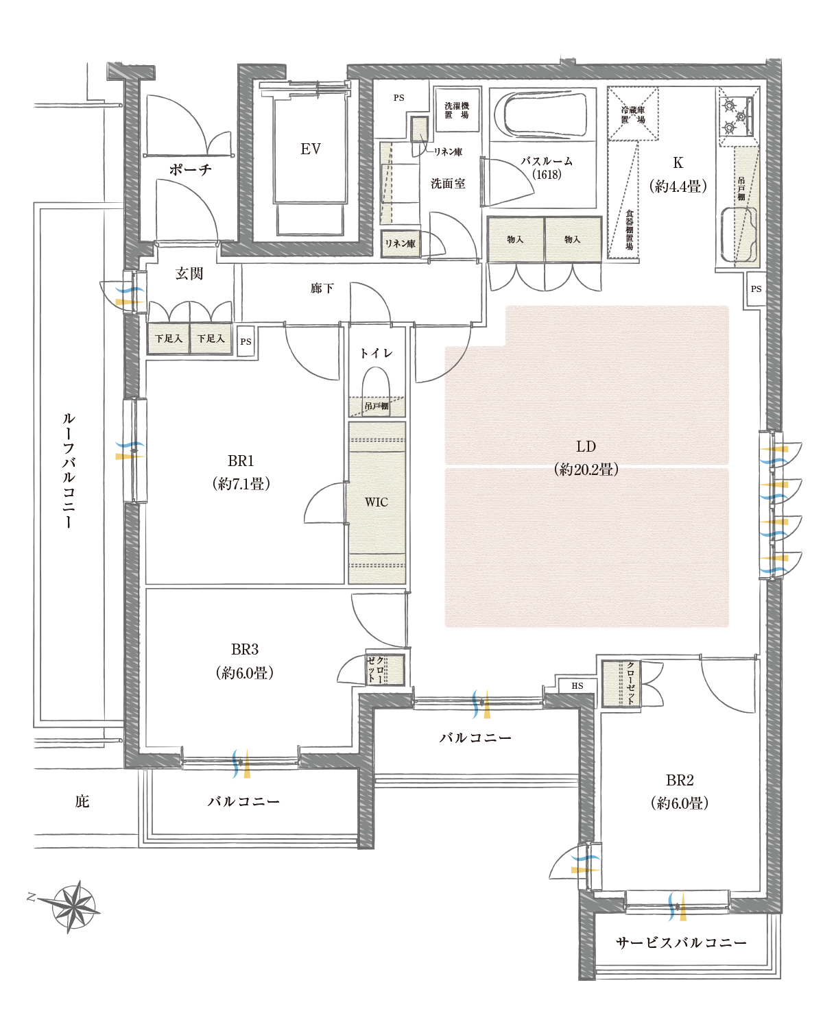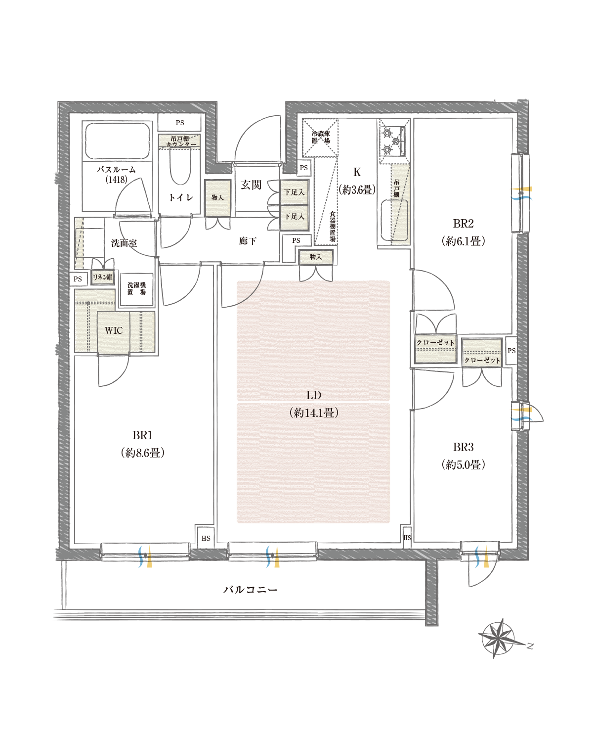 LD:リビング・ダイニング K:キッチン BR:ベッドルーム WIC:ウォークインクローゼット PS:パイプスペース