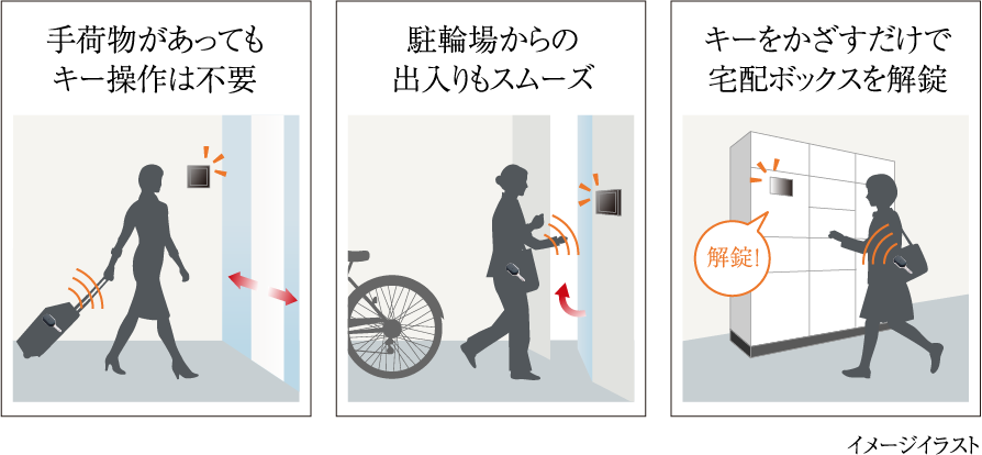 ラクセスキーを携帯するだけで、リーダより最大2.0mの距離で自動認証。鍵を取り出さずに共用エントランスをスムーズに解錠・開扉でき、快適性を高めます。