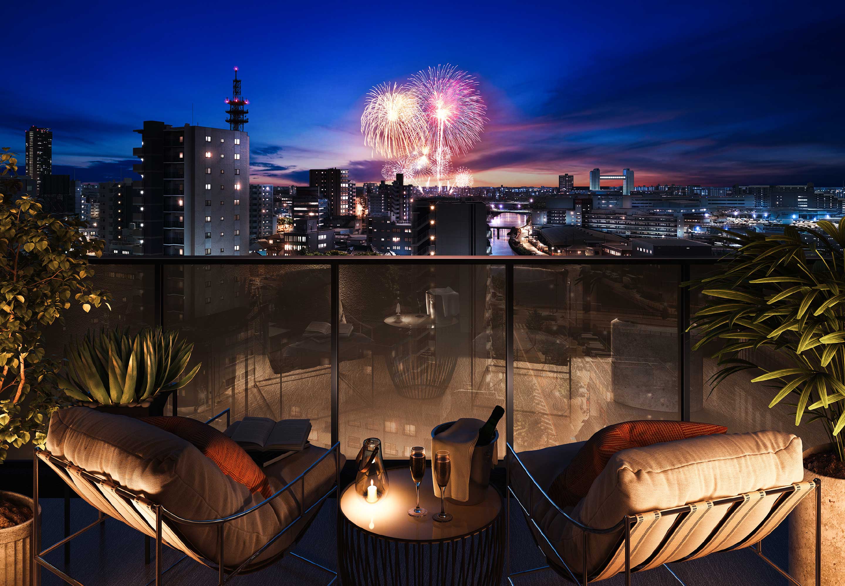 掲載の花火イメージは熱田祭りの花火イメージをCG加工したもので、住戸の向き・階数により実際の見え方は異なり、全住戸から花火が見えることを保証するものではございません。打ち上げ場所や開催等は予告なく変更される場合があります。