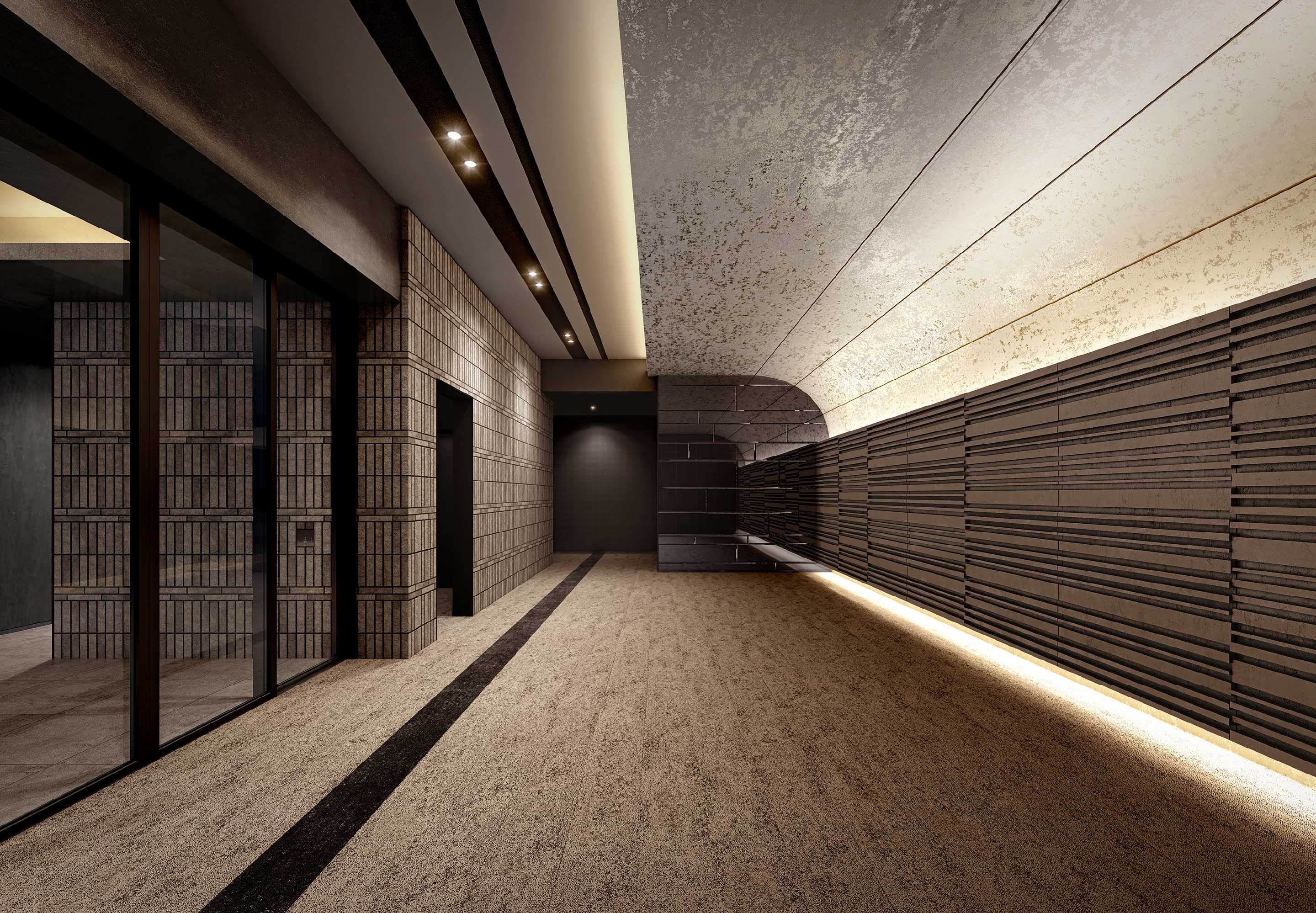 都心の大空へ立ち上がるダイナミックな外観デザインに対しアプローチは擁壁で囲まれたプライベート性の高い設計。エントランスホールは天井高約3.20mがもたらす開放感に加え、奥へ導くR形状のデザイン壁や視線を集めるミラー壁が、空間の奥行きを広げるデザインに。都市に佇むミュージアムのような、洗練されたプライベート空間を創出します。