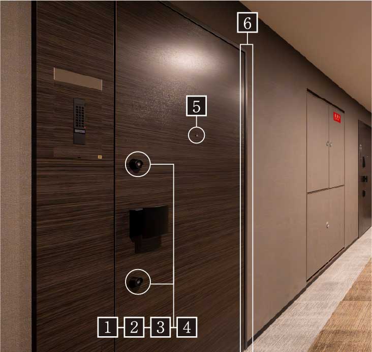 - 玄関キーには鍵違い数が約5兆5千億通りあり、複製が困難でピッキングの防犯対策にも有効なディンプルキーを採用。