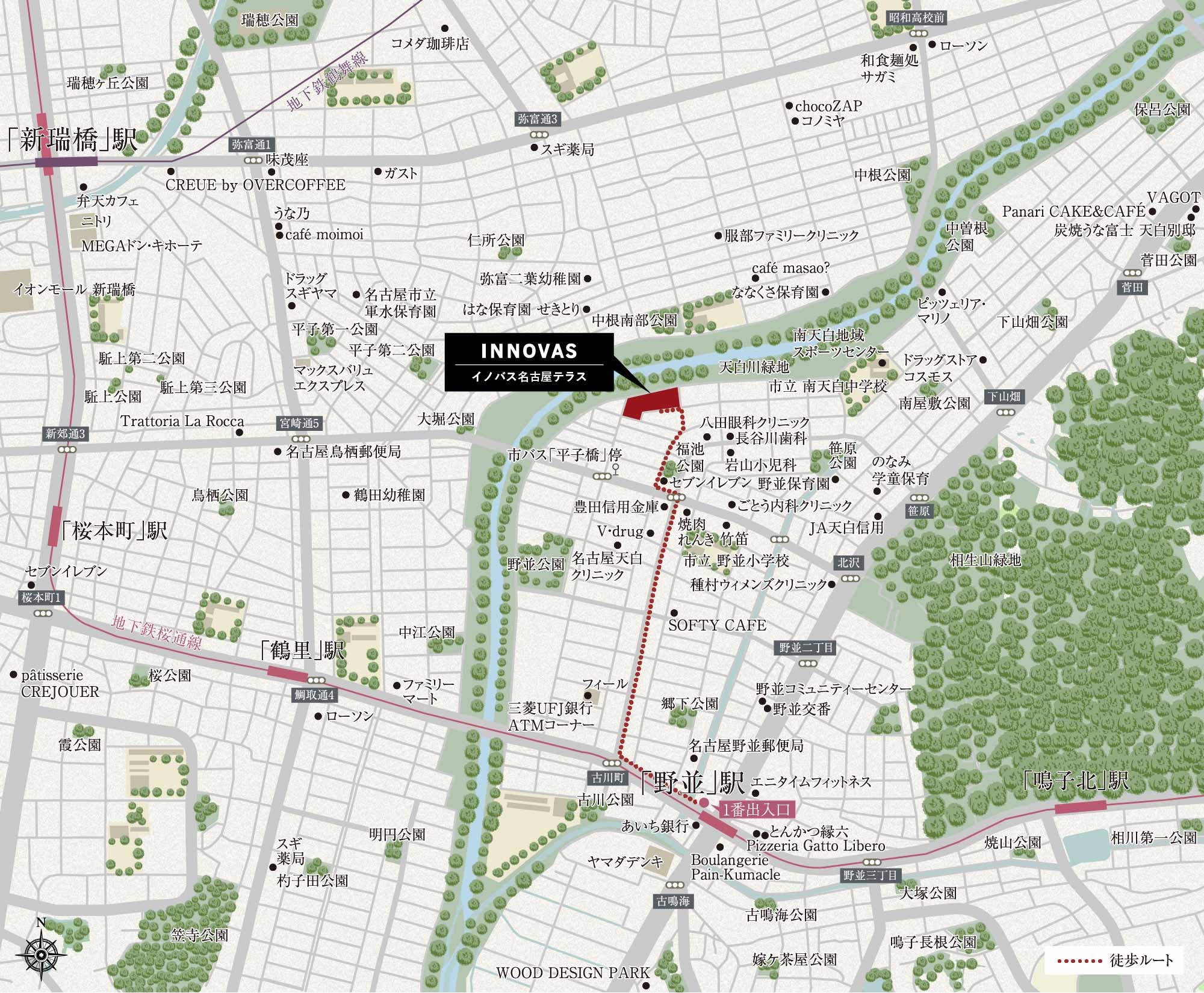 - 表示距離は現地からの地図上の概算です。徒歩分数は80m=1分として算出し、端数は切り上げております。