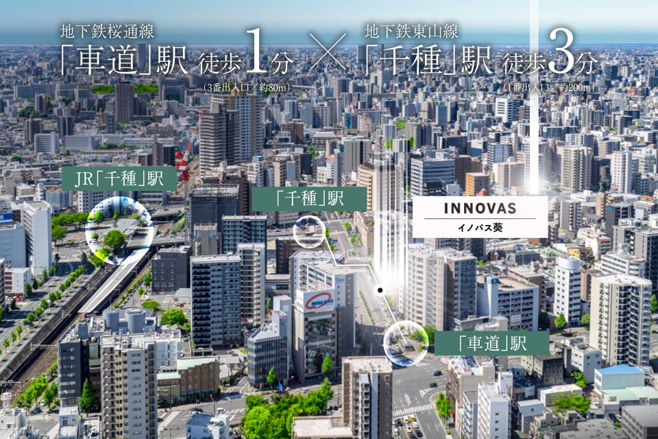 名古屋市営地下鉄桜通線「車道」駅徒歩1分名古屋市営地下鉄東山線「千種」駅徒歩3分JR中央本線「千種」駅徒歩6分